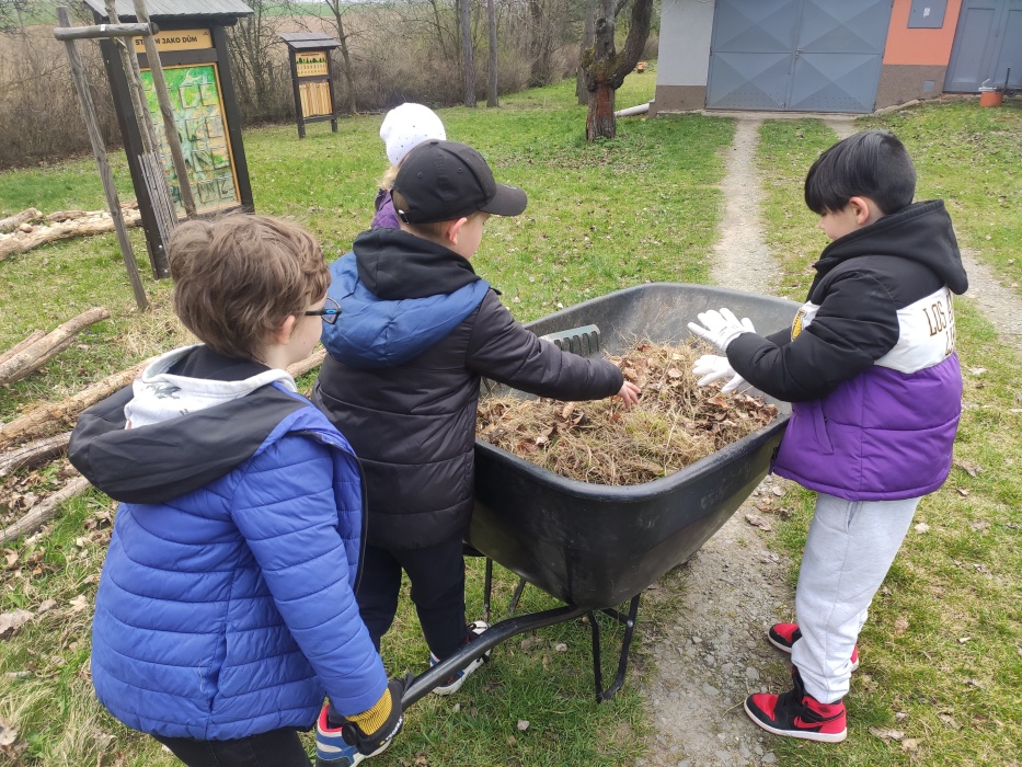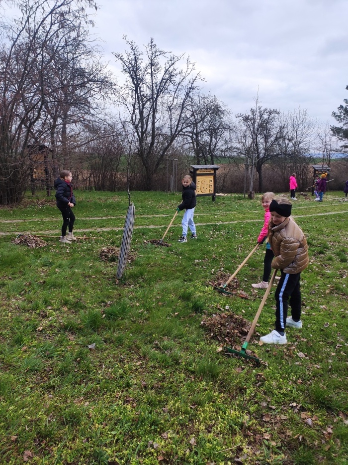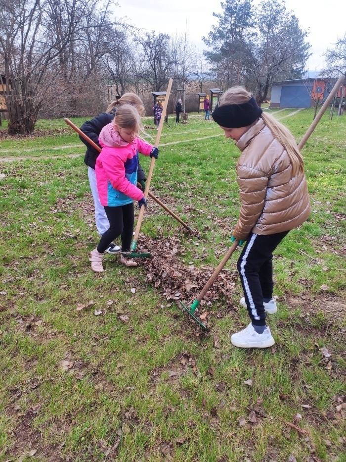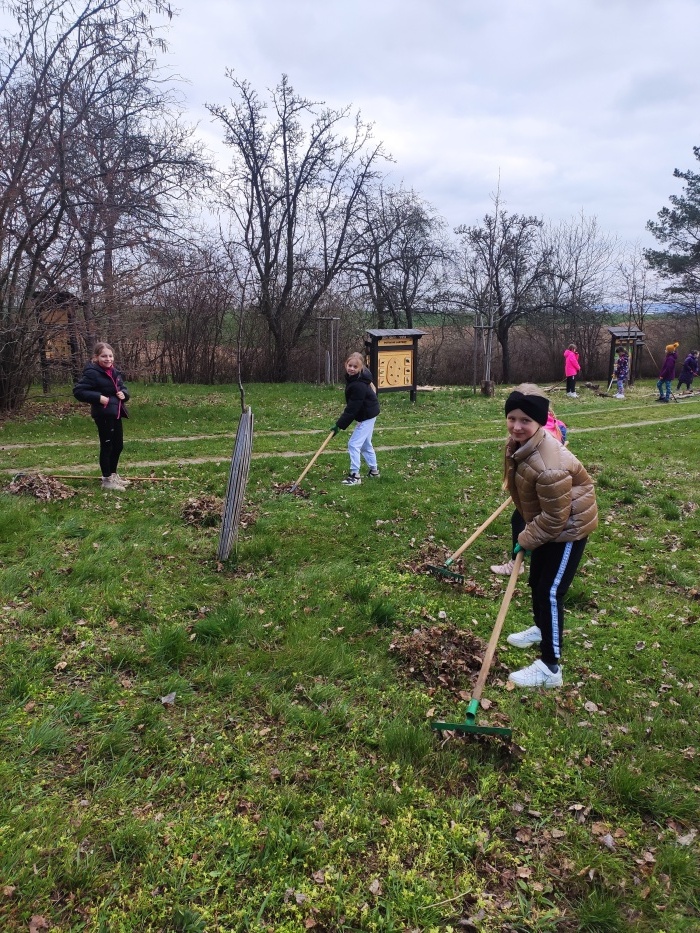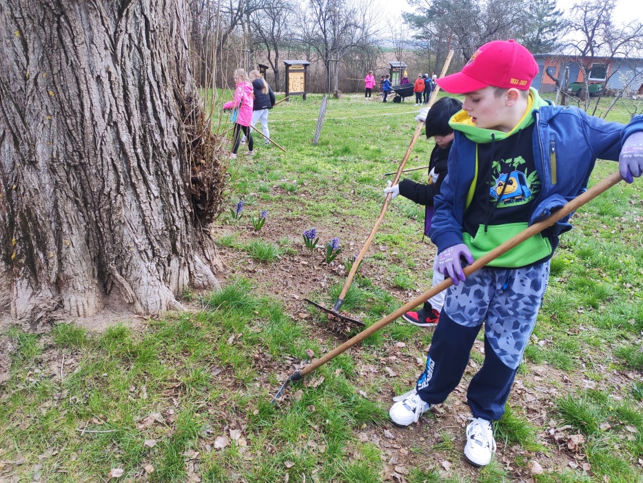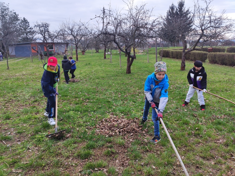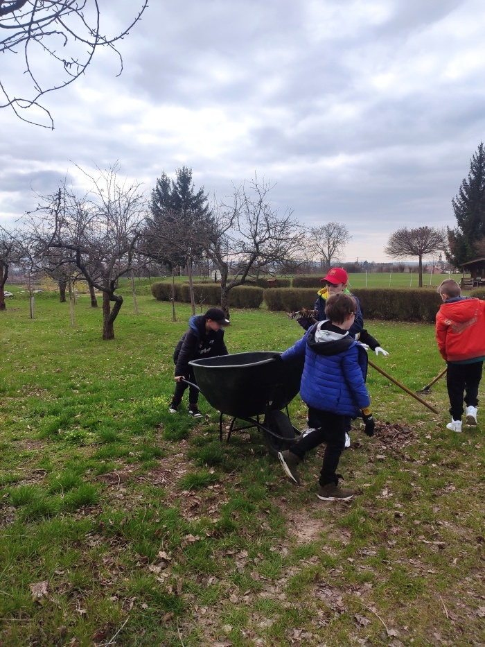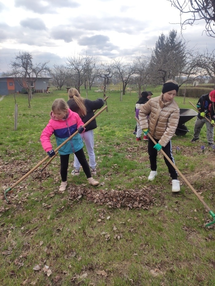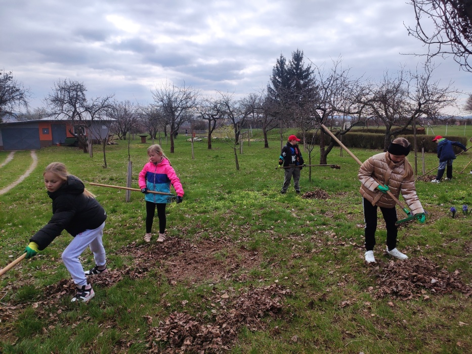 Hrabání listí a suché trávy.