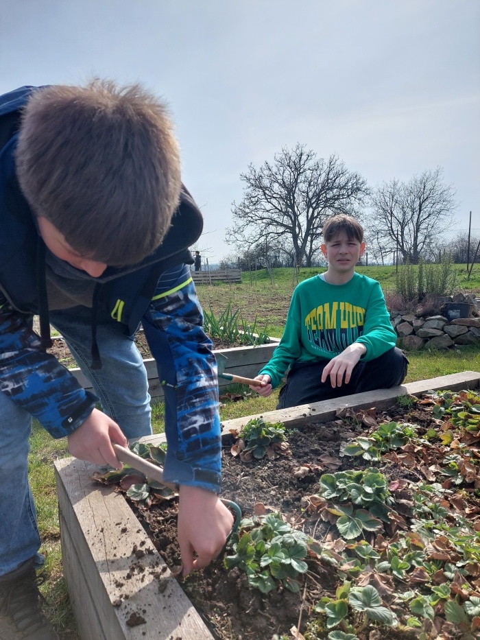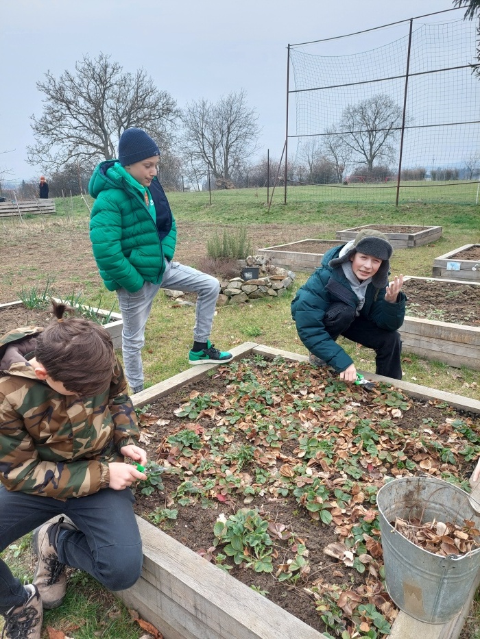 Odstraňování plevele a uschlých listů z jahodníků.