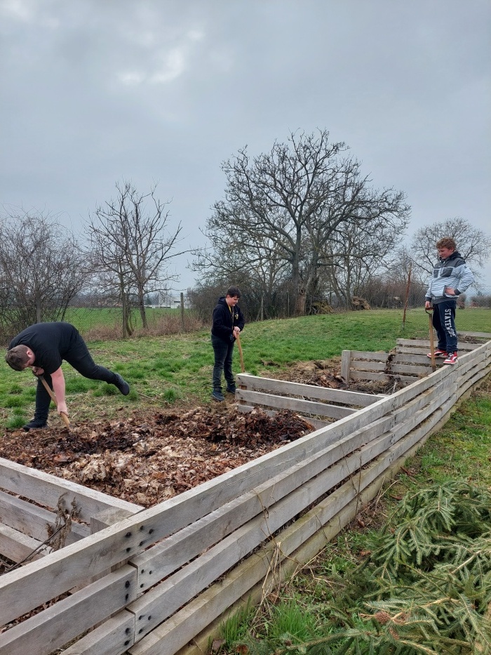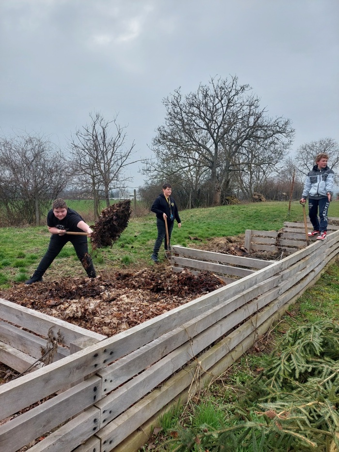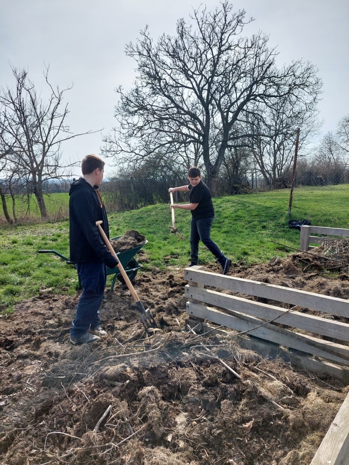 Pravidelné promíchání obsahu kompostéru, aby se urychlil rozklad a zlepšila se cirkulace vzduchu.