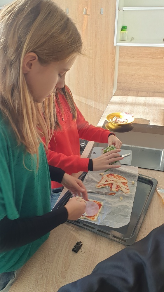 Pekli jsme strašidelné duchy z těsta, které jsme ozdobili tak, aby vypadali jako malí duchové. A protože nám zbylo těsto, rozhodli jsme se udělat i mini pizzy – každý si mohl vytvořit vlastní variantu a při tom popisovat, co na ni dává: I’m adding cheese, I like tomatoes, Can you pass me the sauce, please?