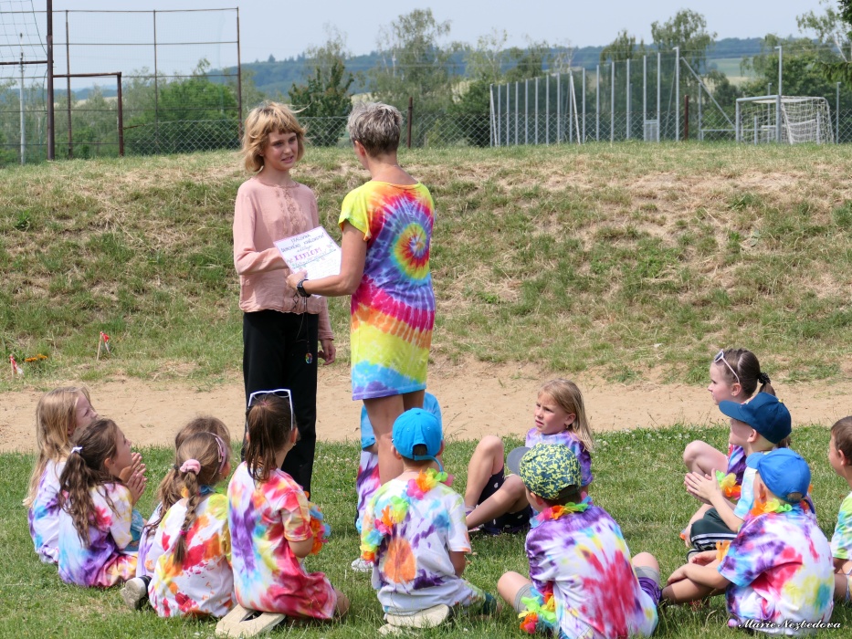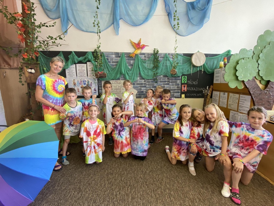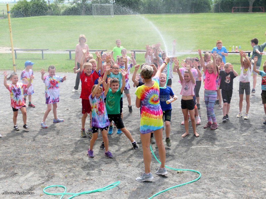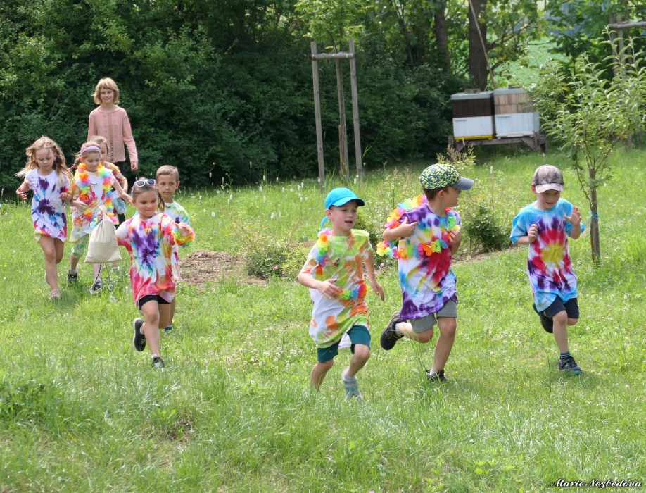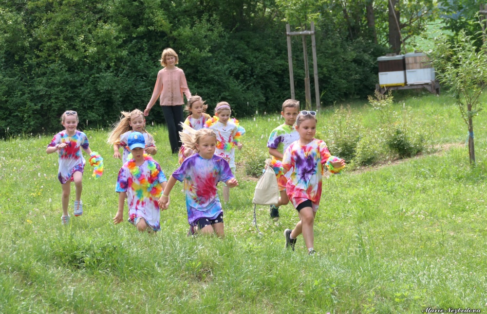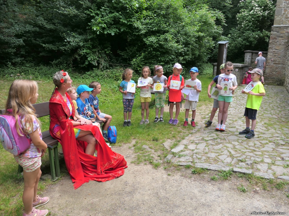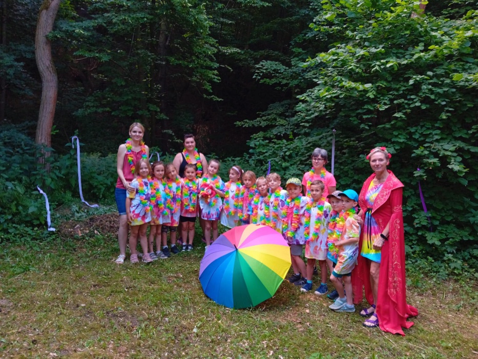 První letní den je znamením vyrazit za pokladem. A proto se děti z 1. B vydaly po stopách Kašpárka. Cestou plnily různé úkoly, až došly ke studánce Strachotince. Tam je čekala královna duhového království.