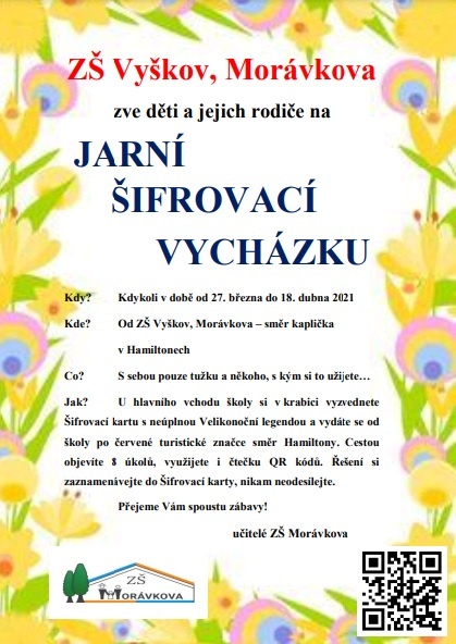 Zveme děti a jejich rodiče na JARNÍ ŠIFROVACÍ VYCHÁZKU od ZŠ Vyškov, Morávkova – směr kaplička v Hamiltonech.