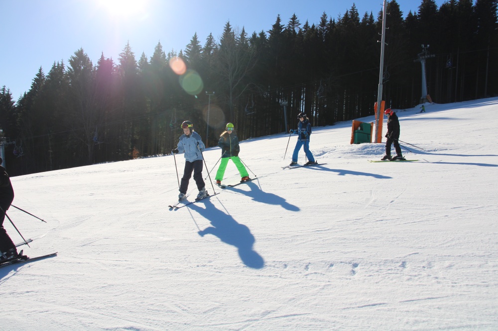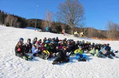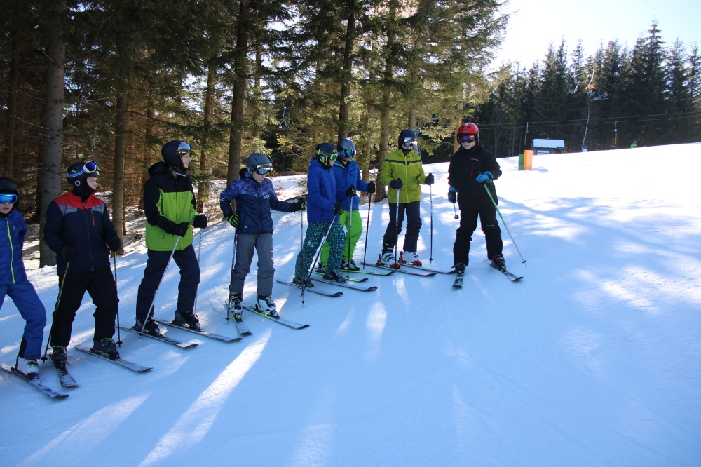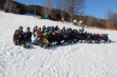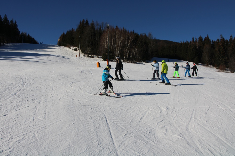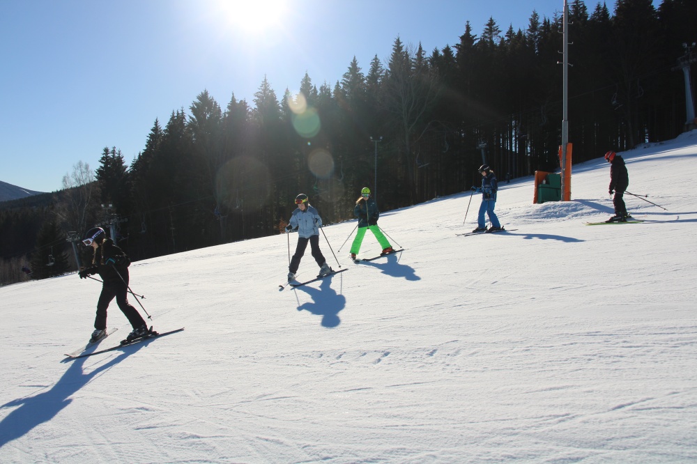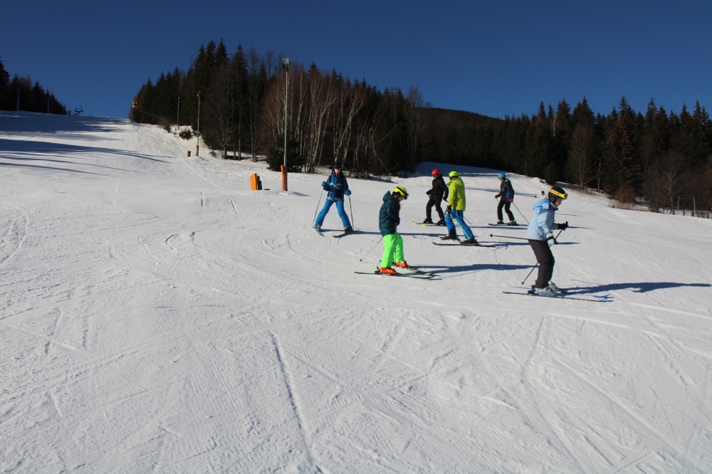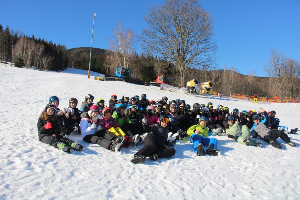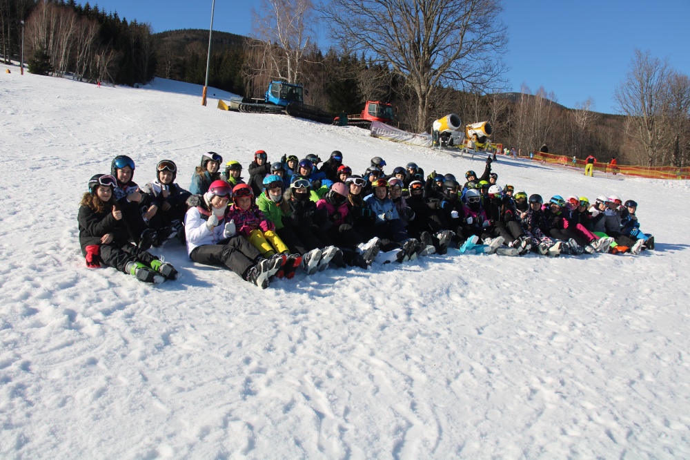 A tak se i žáci ze sedmých a osmých tříd naší školy vydali do hor - zúčastnili se lyžařského výcvikového kurzu ve Filipovicích v Jeseníkách. Nejenže jsme si všichni báječně zalyžovali, zdokonalili se i v metodice, ale také si užili spoustu legrace během našeho nabitého programu. Ten byl zpestřen návštěvou hotelového bazénu, přednáškami, večerním lyžováním, společnými večerními hrami, závodem ve slalomu, výrobou odznáčků, cukrovou vatou, kinem s popkornem či rozlučkovou párty. Rozhodně jsme se nenudili. Přesto, že nám zpočátku počasí moc nepřálo, hodili jsme to za hlavu s rozcvičkovou básní Leze žába po žebříku, natahuje elektriku, nejde to, nejde to, necháme to…na léto! Na fotkách níže můžete vidět, že i sluníčko jsme tím rozesmáli a probudili :).