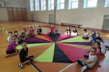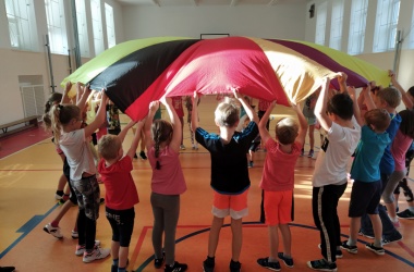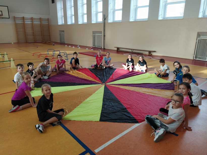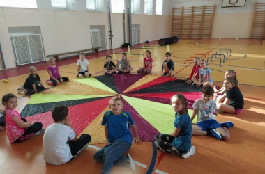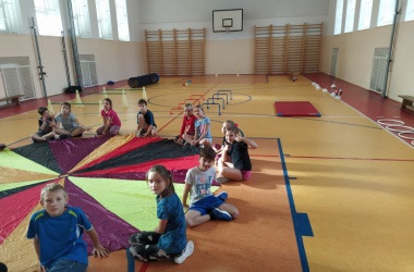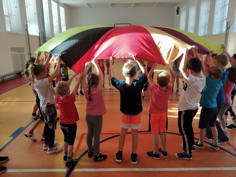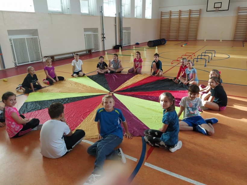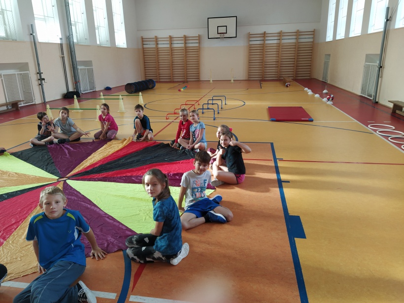 Na závěr hodiny se všechny děti seběhly dohromady a při relaxačním cvičení s padákem se navzájem rozloučily.