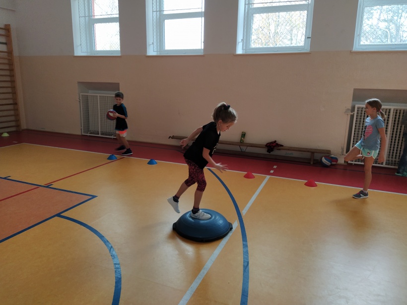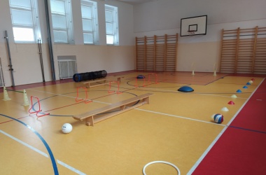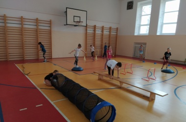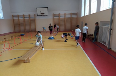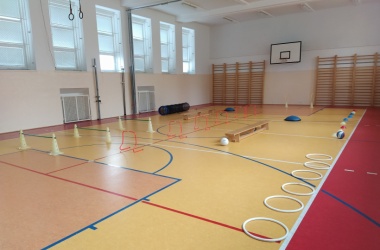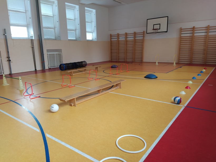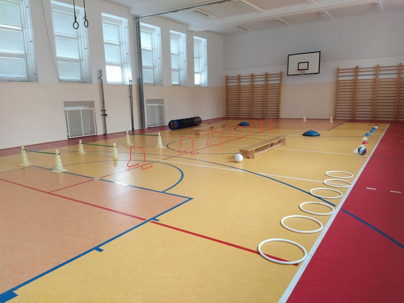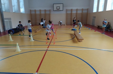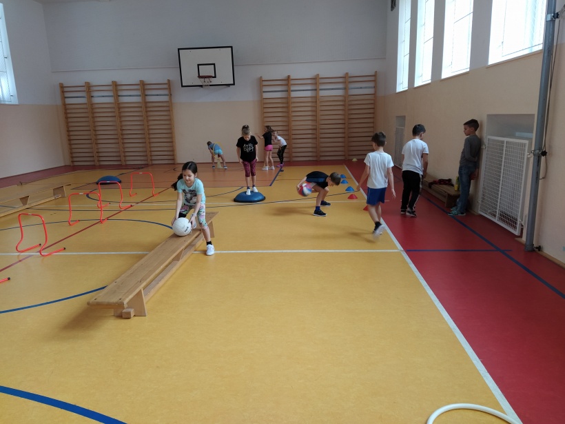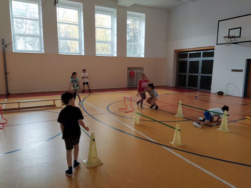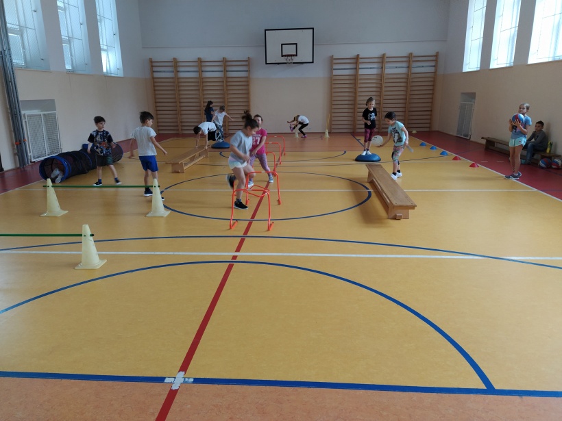 Žáci pro předškolní děti rozmístili po celé tělocvičně sportovní náčiní a vytvořili tak překážkovou dráhu. Děti si mohly vyzkoušet chodit po laně, plazit se, prolézat tunelem, válet sudy, driblovat, přeskakovat překážky, přebíhat lavičku, proskákat snožmo kruhy nebo házet na cíl.