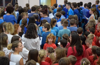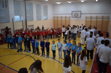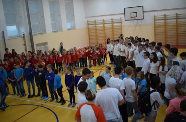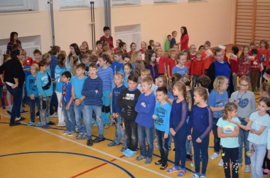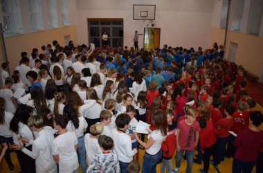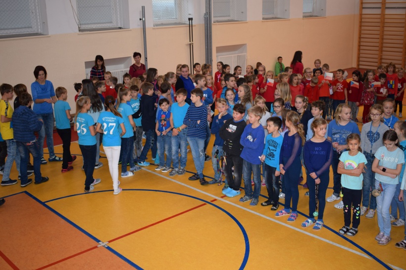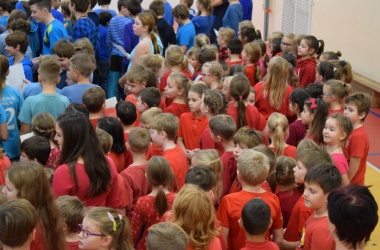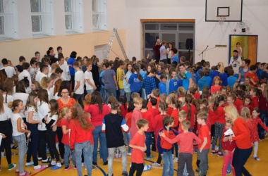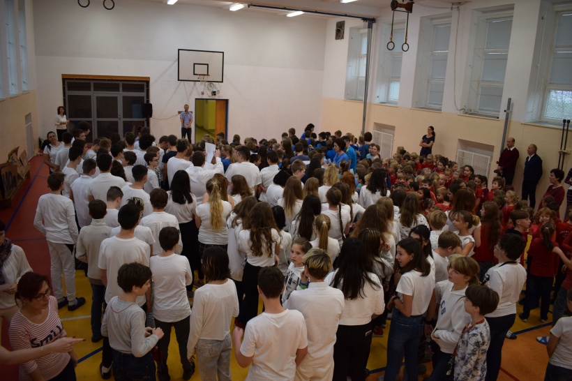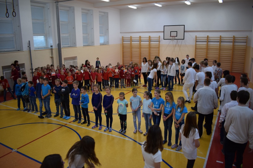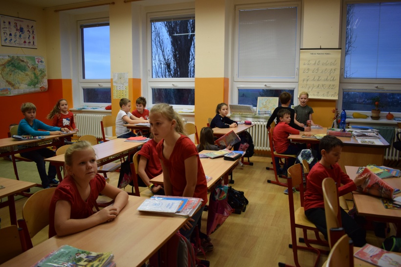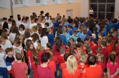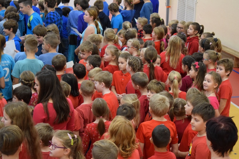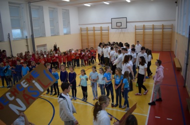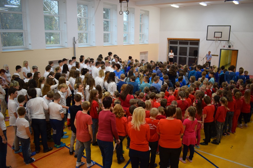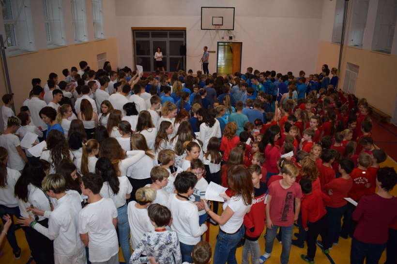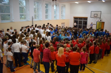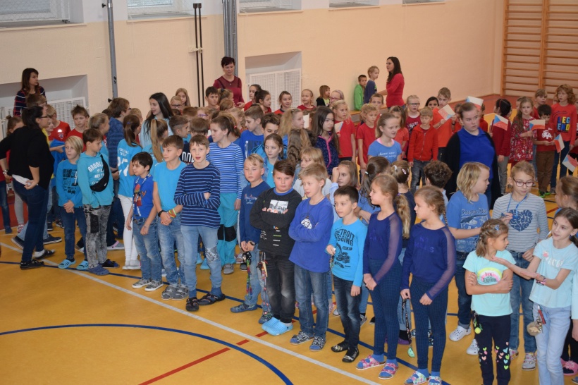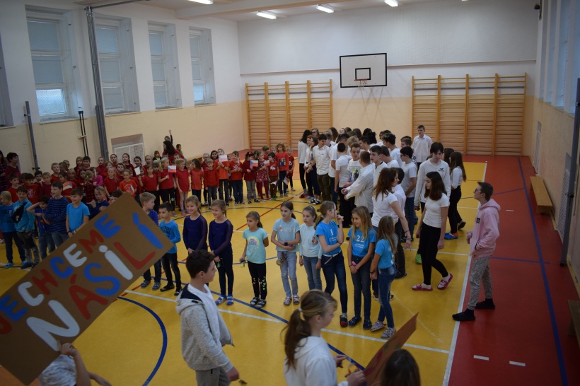 Oslavy jsme završili v pondělí 18. listopadu v tělocvičně školy společným zpěvem písně Náměšť od Jaroslava Hutky a při písni Modlitba pro Martu jsme vytvořili českou vlajku. Všichni žáci i učitelé přišli totiž oblečeni v národních barvách – bílé, červené a modré.