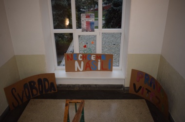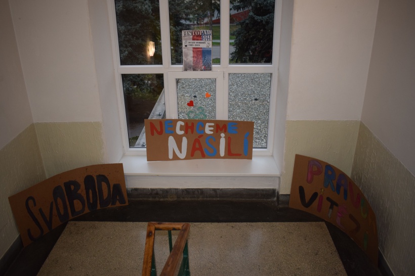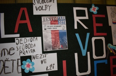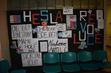 Vyzdobili jsme školu hesly, která zněla při sametové revoluci 1989, a symboly jako byly klíče nebo známým „véčkem“, mladší žáci malovali státní vlajku.