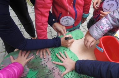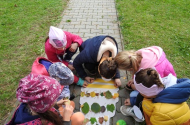 Děti společnými silami obkreslily svoji ruku na čepičku skřítka a nalepily listy místo vousů.