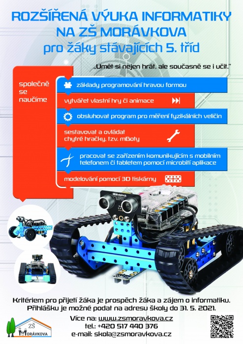 Pro uvedené důvody provádíme výběr žáků do třídy s rozšířenou výukou informatiky. Žáky budeme přijímat na základě podané přihlášky, která je k dispozici na našich webových stránkách www.zsmoravkova.cz. Kritériem pro přijetí žáka je zájem o informatiku a prospěch žáka. Přihlášku je možné podat do 31. května 2021. O přijetí / nepřijetí žáka budeme zákonné zástupce žáků informovat do 10. června 2021.