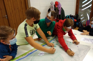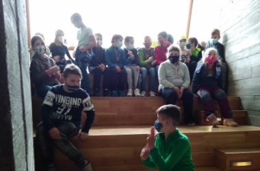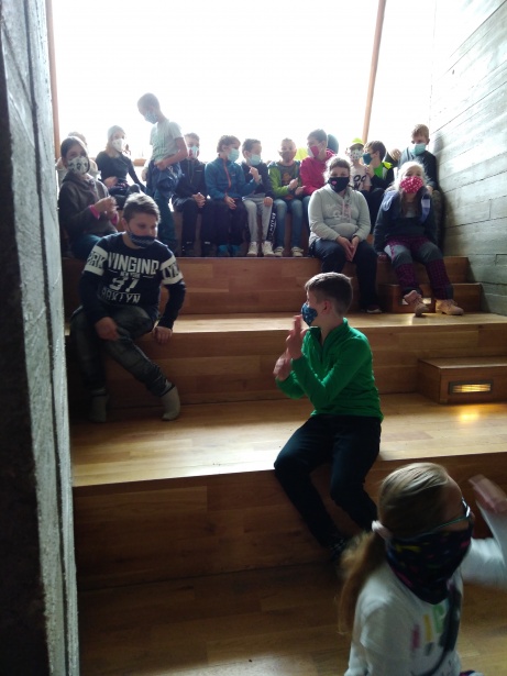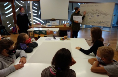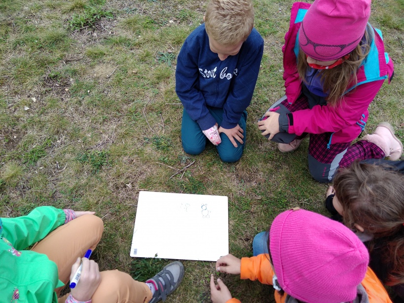 Mezitím žáci 5. A odstartovali svůj program „Na úpatí Pavlovských vrchů“ přímo v archeoparku. Rozdělili se do skupinek, které představovaly jednotlivé osady, a plnili různorodé úkoly. Po jejich dokončení je čekala odměna v podobě papírových modelů budov, které pro svou osadu získali. Ty nakonec usadili do mapy svého sídliště tak, jak předpokládali, že mohly být rozmístěny i tehdy. Nic lehkého to nebylo, protože pro každé umístění potřebovali pádný argument, proč zvolili zrovna toto místo. Poté se dozvěděli výhody i nevýhody svého uspořádání osady.