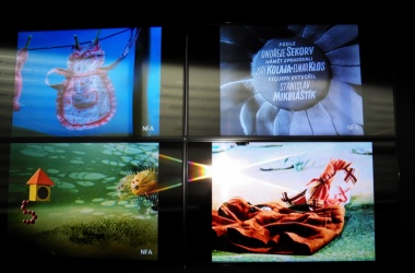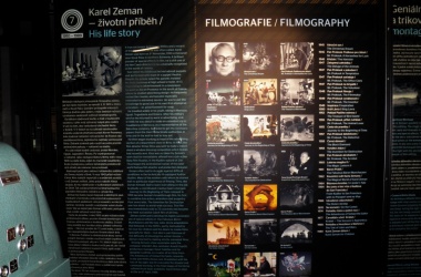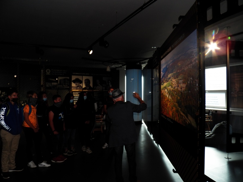 Žáci byli rozděleni do dvou skupin. První skupina absolvovala komentovanou prohlídku expozice, ve které jsme se dozvěděli zajímavosti o vzniku a vývoji filmových ateliérů. Expozice je koncipována jako svitek filmu v kameře, součástí jsou i dobové projekce a filmové plakáty. Nejvíce pozornosti je věnováno Hermíně Týrlové a Karlu Zemanovi, jejich slavným filmům a trikovým záběrům (Cesta do pravěku, Ferda Mravenec či Uzel na kapesníku, podle něhož dostal Filmový uzel své jméno). Průvodcem nám byl kameraman Zdeněk Krupa, který se podílel na známých večerníčcích Pat a Mat, Krysáci či na filmu Čarodějův učeň slavného režiséra Karla Zemana. Zhlédli jsme také nejlepší animované snímky studentů Univerzity Tomáše Bati ve Zlíně.