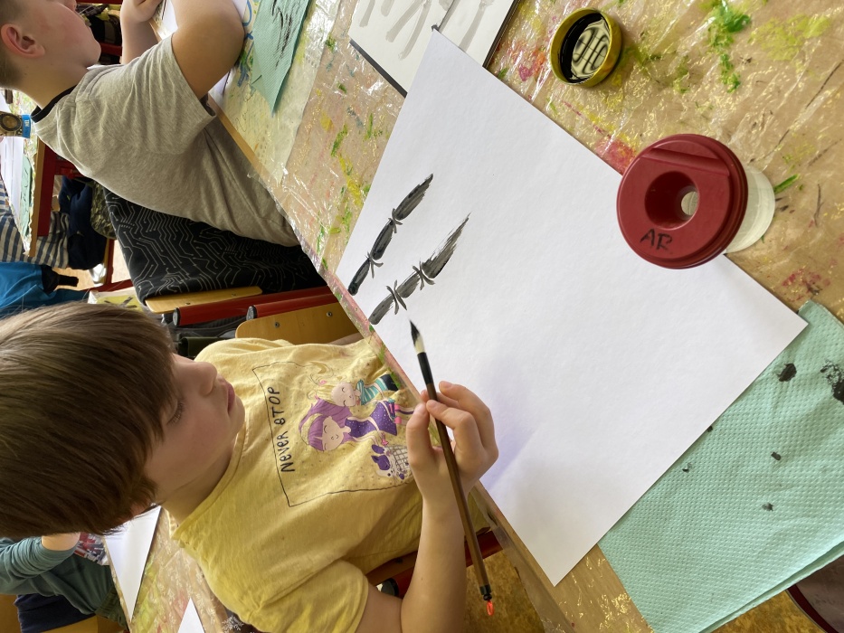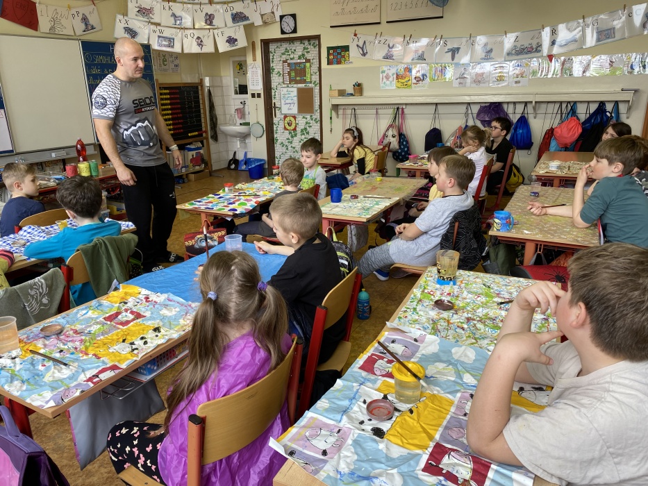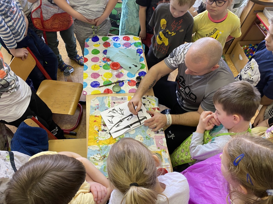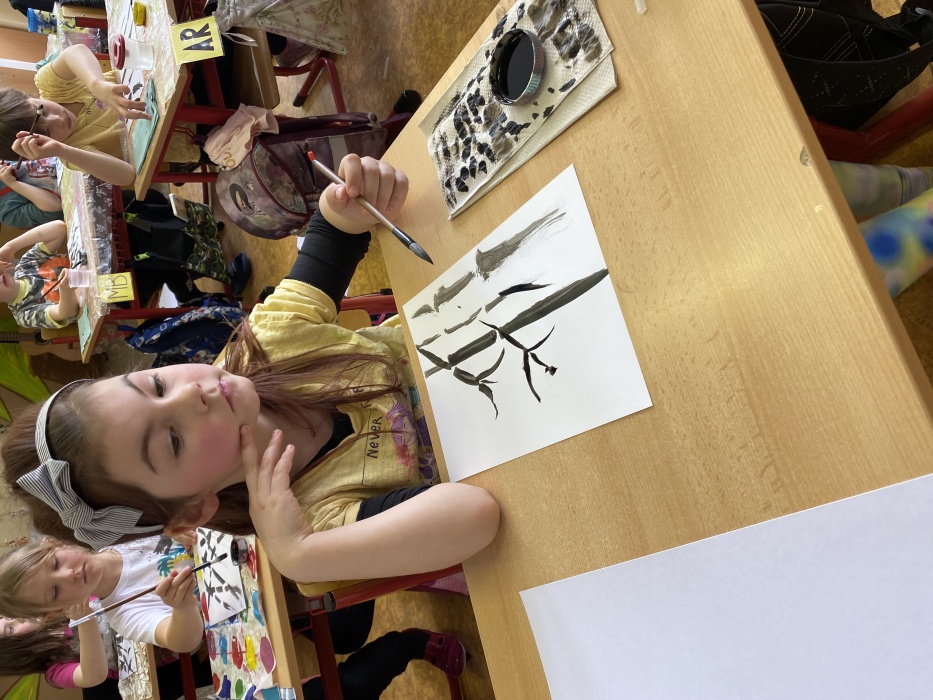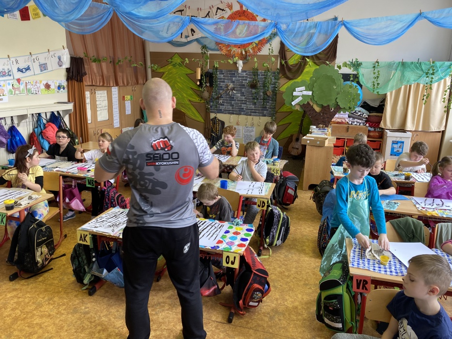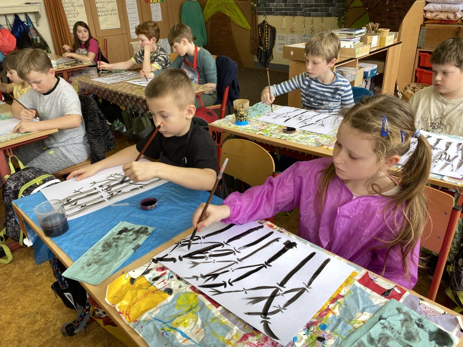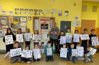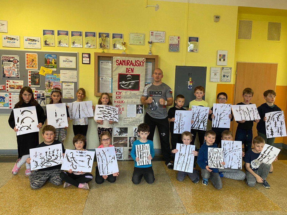Ve druhé části dne jsem pro děti připravil výuku japonské malby tuší sumi-e a znovu mě čekalo příjemné překvapení, jak děti ke všemu přistupovaly. Předávat samurajské poselství širokému okolí je pro mě obrovskou výzvou a životním posláním! Ještě jednou děkuji paní učitelce Kateřině Gibalové, že mě pozvala a vše potřebné zařídila včetně kávy, výborného dortu a nečekaných darů.