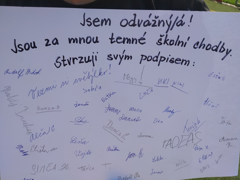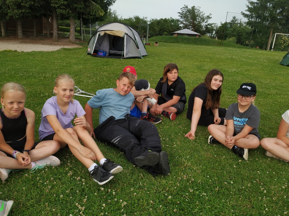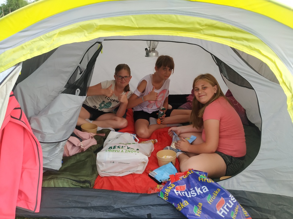 Z 20. na 21. června jsme přespávali ve stanech na školní zahradě. Sešly se třídy 5. A a 4. B a jejich paní učitelky a asistentky. Hráli jsme spoustu zábavných her. Mě nejvíc zaujala hra petanque. Po setmění nás čekala noční hra – stezka odvahy chodbami temné školy. Z ní jsme si jako trofej odnesli svítící náramky. Nejhezčí bylo, když jsme svítící náramky vyhazovali do nebe a vytvořili světelnou šou. Moc se mi stanování líbilo, chtěla bych to zažít znovu.